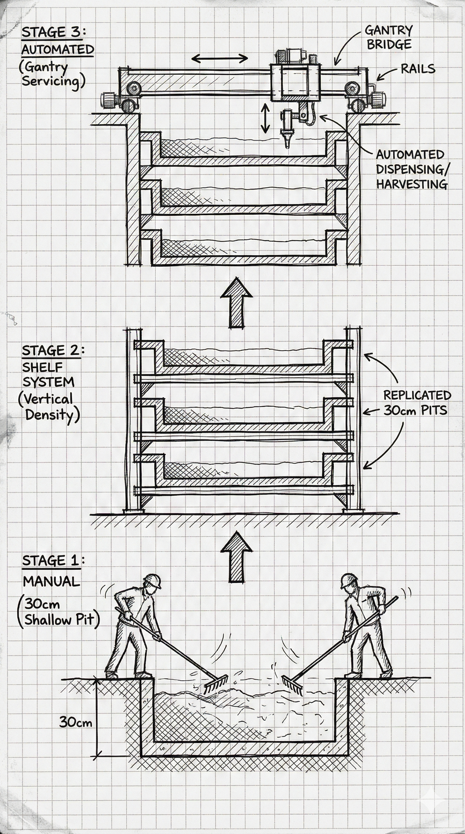 Western engineers often attempt to build "clean-room" robotics from the ground up. In contrast, Ruilong explains that Chinese automation is often the result of "Automated Manual Labor." * The Logic: Many facilities began as manual "Pit Farms"—simple concrete rearing pits. As they scaled, they didn't replace the pits; they layered them and added mechanical gantry systems to service them.