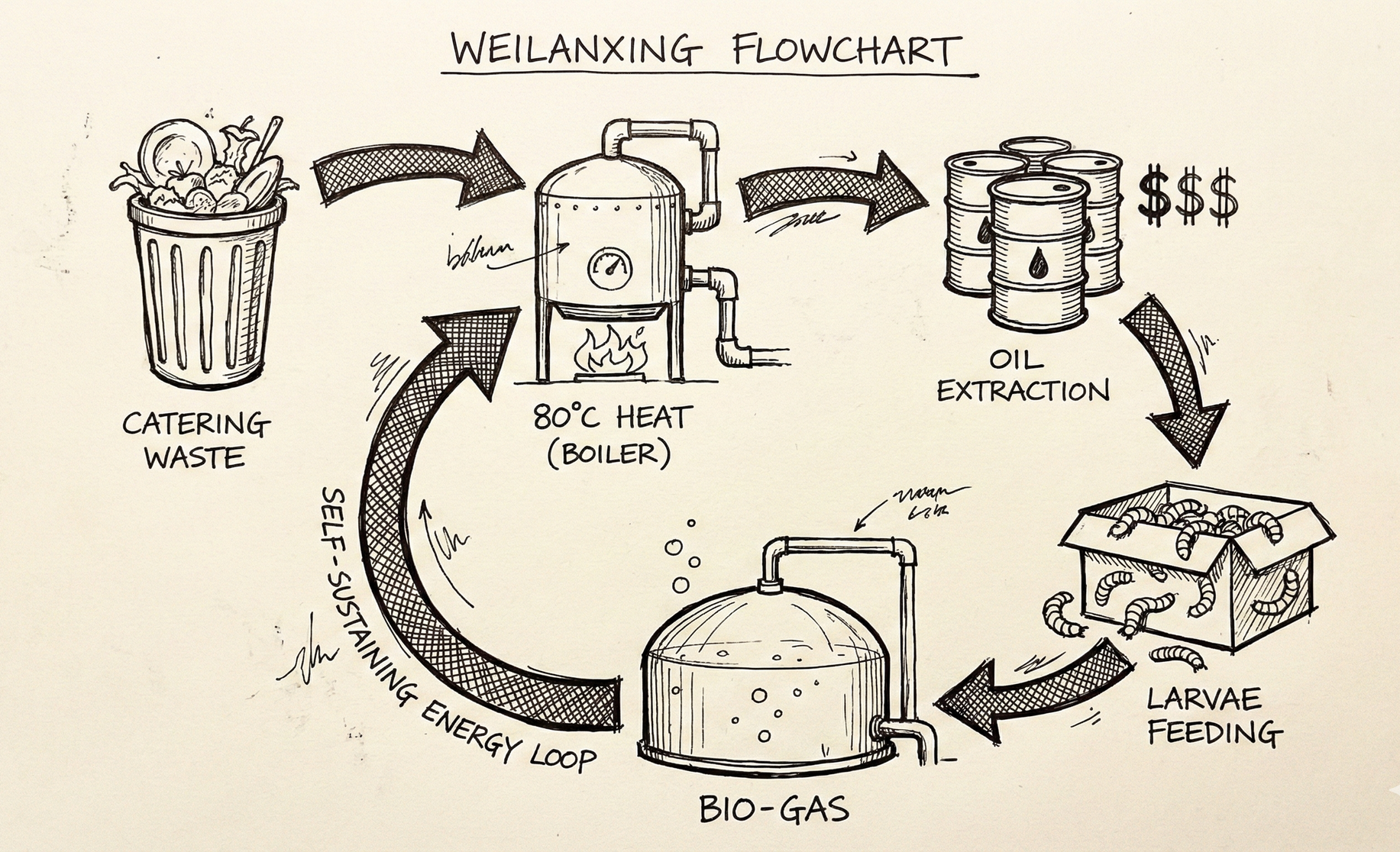 - Bio-Gas Integration: Wastewater is sent to fermentation tanks to produce Bio-Gas, which is then used to power the 80° C boilers and larval dryers, creating a self-sustaining energy loop.